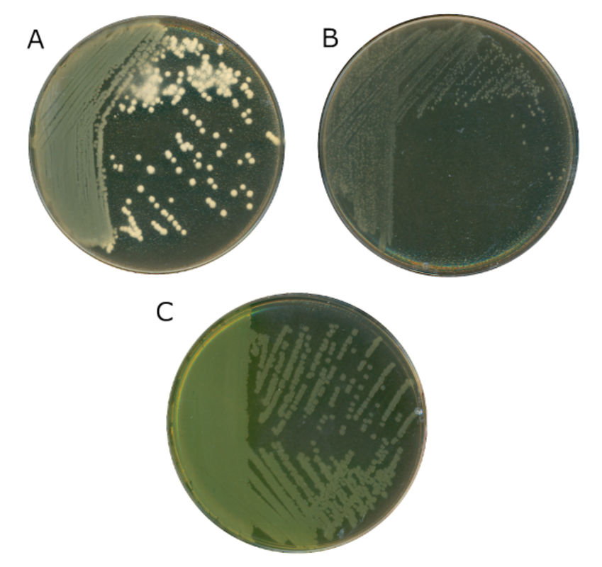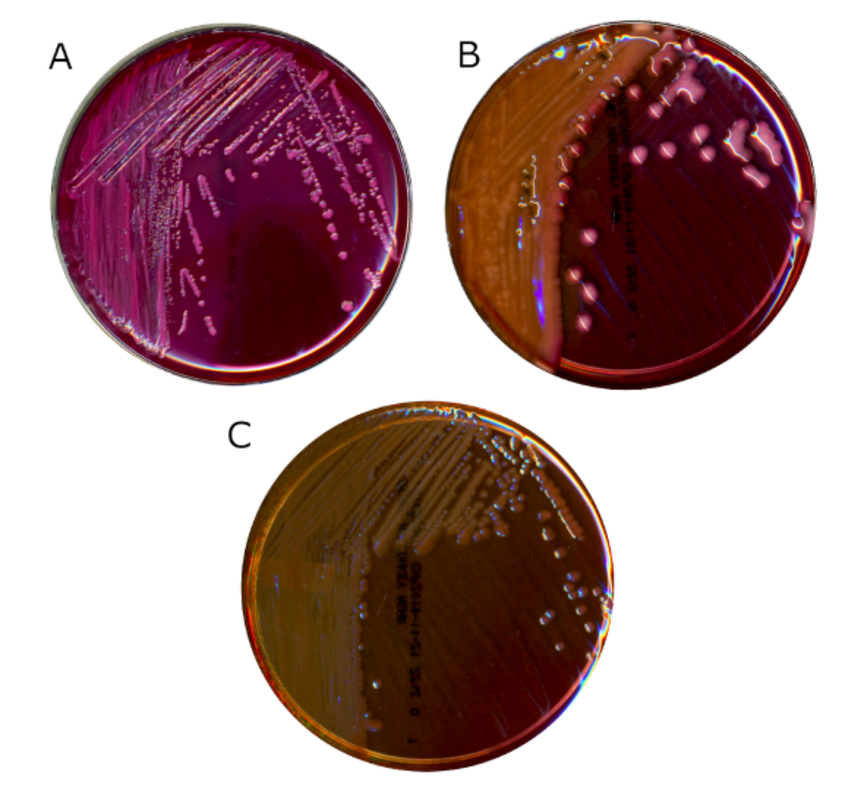 Современный, коммерчески доступный агар МакКонки. На фото А показана Escherichia coli, ферментирующая лактозу. Обратите внимание на непрозрачный розовый желчный осадок вокруг колоний. На фото Б показана Klebsiella pneumoniae, также ферментирующая лактозу. Колонии розовые, что указывает на выработку кислоты, но желчный осадок отсутствует. На фото С показана Pseudomonas aeruginosa, неферментирующая лактозу. Источник: K.P. Smith.