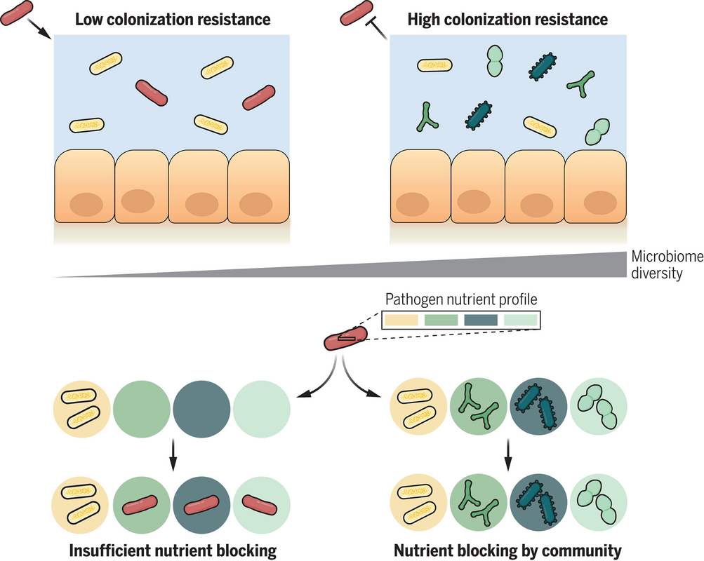 Патогены (красные) не могут колонизироваться, когда они совпадают с сообществом (желтые и зеленые бактерии) в профилях потребления питательных веществ (питательные ниши обозначены цветными кружками). По мере увеличения разнообразия микробиома возрастает вероятность потребления различных питательных веществ, что помогает блокировать рост патогенов и повышает колонизационную резистентность.