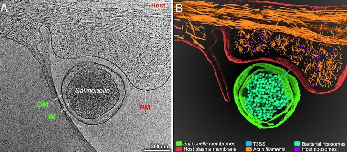 Слева - криоэлектронное изображение S. Typhi, взаимодействующей с мембраной клетки хозяина. Справа - сегментация изображения слева с аннотацией различных клеточных компонентов.