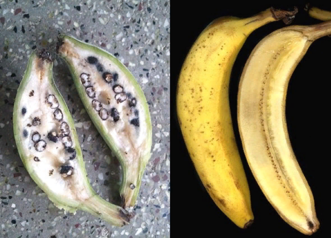Поперечные срезы диких и одомашненных бананов, демонстрирующие крупные, вкрапленные семена диких бананов, которые отсутствуют у одомашненных бананов.