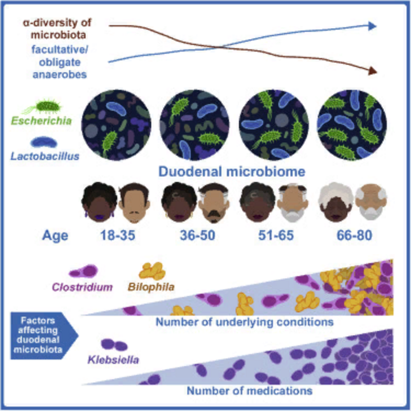 Относительное обилие (ОО) филума Proteobacteria увеличивается у пожилых людей, с увеличением ОО семейства Enterobacteriaceae и колиформных родов Escherichia и Klebsiella, и связано с изменением ОО других дуоденальных микробных таксонов и уменьшением микробного разнообразия. Увеличение ОО конкретных родов связано только с хронологическим возрастом (Escherichia, Lactobacillus и Enterococcus), только с количеством принимаемых лекарственных препаратов (Klebsiella) или только с количеством сопутствующих заболеваний (Clostridium и Bilophila).
