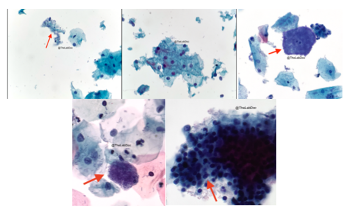 ВПЧ, с которым связан риск развития рака шейки матки, остается наиболее важным микроорганизмом, выявляемым в ПАП-мазках. Учитывая связь ВПЧ с развитием рака, очень важно исследовать образцы на наличие поражений шейки матки и сопутствующих патологий. ВПЧ в категории низкого риска обычно ассоциируется с низкоградиентными сквамозными интраэпителиальными поражениями, а ВПЧ в категории высокого риска - с высокоградиентными сквамозными интраэпителиальными поражениями и инвазивной сквамозно-клеточной карциномой. Другие вирусные этиологии, наблюдаемые в ПАП-мазках, включают вирус простого герпеса (HSV) и цитомегаловирус (CMV). Инфекция HSV может протекать бессимптомно, но наиболее распространенным симптомом является развитие везикулопустулезных или небольших язвенных поражений на гениталиях. Классическими цитопатологическими признаками HSV-инфекции являются: многоядерность, слипание ядер и маргинация хроматина. Инфекции CMV встречаются редко, обычно протекают бессимптомно и могут быть преходящими. На мазках инфицированные клетки могут выглядеть с внутриядерными включениями, окруженными ореолом.