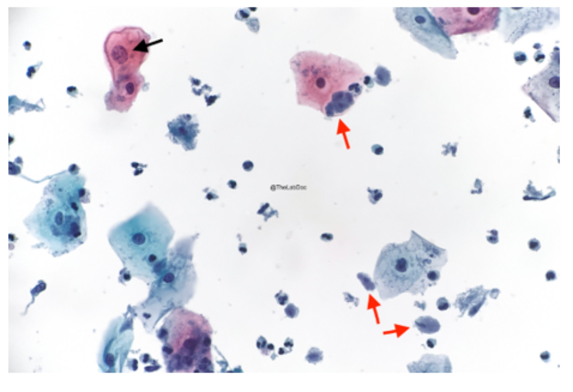 Рисунок 2. Грушевидные кругло-овальные Trichomonas spp. (красные стрелки) размером 15-30 мкм, встречающиеся поодиночке и группами, известные как "партии трих". Обратите внимание на бледно-везикулярное эксцентрично расположенное ядро и эозинофильные цитоплазматические гранулы. Также выявлены реактивные цитологические изменения (черная стрелка), такие как увеличение ядер и перинуклеарные ореолы. (Фото: Edina Paal, VA Medical Center, Washington DC).