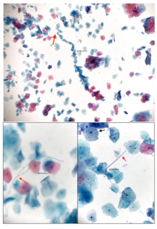 Рисунок 3. "Шашлык": переплетение промежуточных и поверхностных сквамозных клеток с псевдогифами Candida spp. (красная стрелка, вверху). Частично вылеченная кандидозная инфекция. Обратите внимание на плохо сформированные гранулированные псевдогифы (красная стрелка) со значительным эффектом лечения (красная стрелка, внизу).