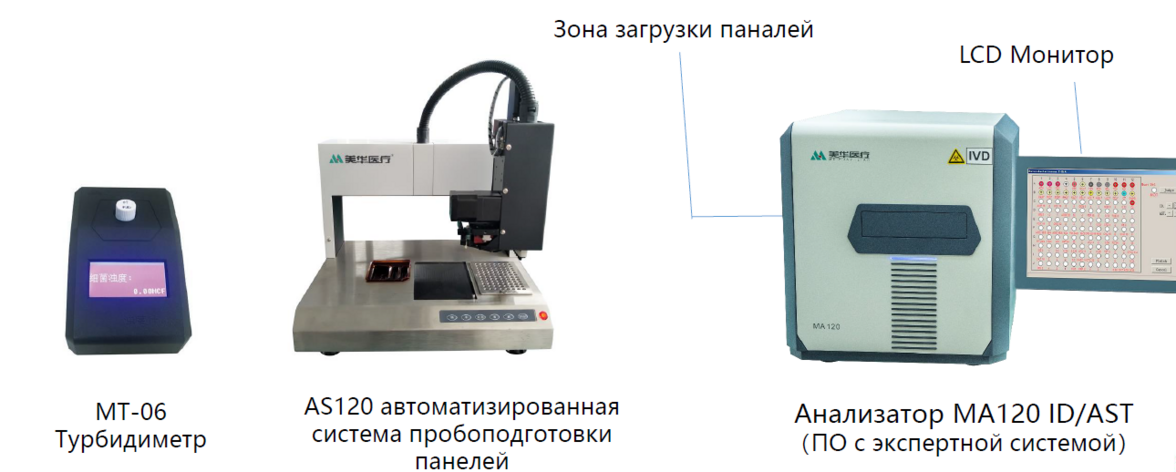 MA120 работает с панелями на 120 лунок, содержащими дополнительные отсеки для суспензии. Предварительное выравнивание мутности бактериальной суспензии осуществляется с помощью турбидиметра MT-06, а заполнение панелей суспензией автоматизировано с помощью роботизированной системы AS120.