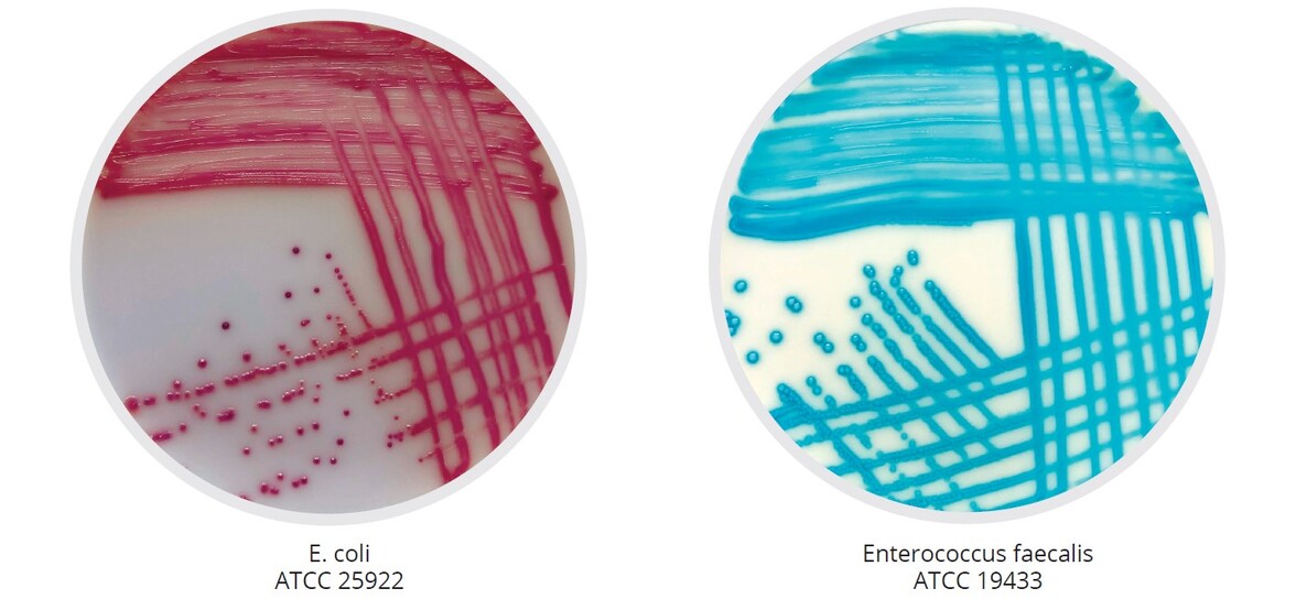 В состав Хромогенного агара входят 2 хромогенных субстрата, ферментируемые кишечной палочкой Escherichia coli, энтерококками Enterococcus spp и другими колиформными бактериями.