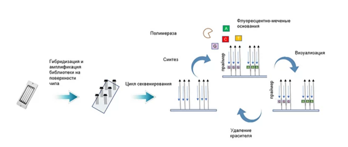 - Далее библиотеки секвенируются за счет обратимой терминации и флуоресцентно меченых нуклеотидов.